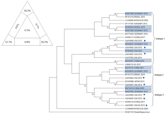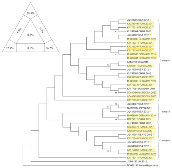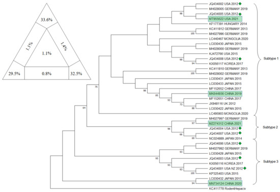 - An, C.H.; Li, J.; Wang, Y.T.; Nie, S.M.; Chang, W.H.; Zhou, H.; Xu, L.; Sun, Y.X.; Shi, W.F.; Li, C.X. Identification of a novel hepacivirus in Mongolian gerbil (Meriones unguiculatus) from Shaanxi, China. Virol. Sin. 2022, 37, 307–310. [Google Scholar] [CrossRef]