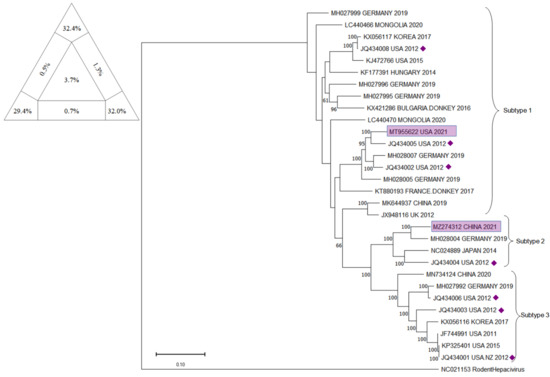 - Chen, Y.; Cai, S.; Zhang, Y.; Lai, Z.; Zhong, L.; Sun, X.; Li, S.; Lu, G. First identification and genomic characterization of equine hepacivirus subtype 2 in China. Arch. Virol. 2021, 166, 3221–3224. [Google Scholar] [CrossRef]