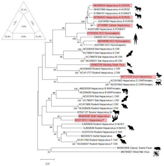 - Schlottau, K.; Fereidouni, S.; Beer, M.; Hoffmann, B. Molecular identification and characterization of nonprimate hepaciviruses in equines. Arch. Virol. 2019, 164, 391–400. [Google Scholar] [CrossRef] [PubMed]