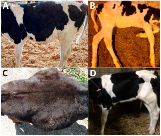 Macroscopic views of the abdomens of Case 2 (A), Case 4 (B), Case 8 (C), and Case 9 (D). (A) Abdominal distention is evident in the ventral region of the right flank. (B) Abdominal distention is not evident in either flank of the depressed, laying-down calf. (C) In the dorsal view, abdominal distention is markedly evident in both flanks. (D) Abdominal distention is not evident in either flank.