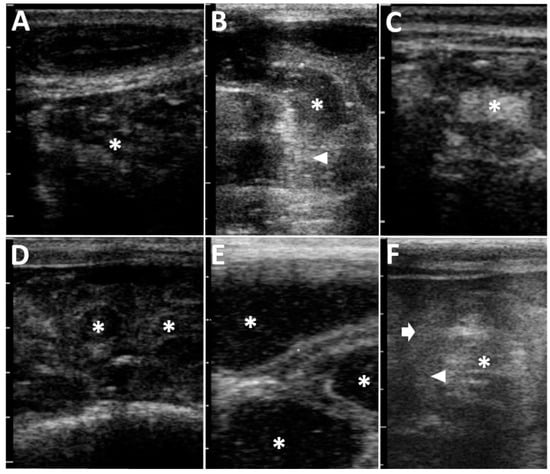 Abdominal ultrasonograms of Case 2 (A), Case 4 (B), Case 5 (C), Case 6 (D), Case 8 (E), and Case 9 (F). (A) The heterogeneously hypo- and hyper-echoic ingesta, including hyperechoic deposits, are seen to fully fill within the severely dilated lumen of the abomasum (asterisk). (B) In a longitudinal section, the dilated intestine includes the hypoechoic fluid contents with multiple hyperechoic deposits (asterisk). An acutely angled narrowing (arrowhead) is evident in the dilated, acutely curved intestinal loop. (C) In a cross section of the round, dilated intestinal loop, the hyperechoic contents (asterisk) are included in the thickened, hypoechoic wall. (D) The intraluminal contents are hypoechoic (asterisks) in multiple cross-sections of the dilated intestinal loops. (E) The hypoechoic contents with hyperechoic spots are included in the 1.5- to 3.0-cm-thick lumens of multiple, dilated intestinal loops (asterisk) seen on the same screen. (F) In the cross-section of the affected loop, the heterogenous hypo- and hyper-echoic contents (asterisk) are seen within the lumen surrounded by the thickened, hypoechoic, double, intestinal walls comprising of intussusceptum (arrowhead) and intussuscipiens (arrow). Scale bar = 10 mm.