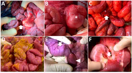 Intraoperative photos of Case 4 (A), Case 5 (B), Case 6 (C), Case 7 (D), Case 9 (E), and Case 10 (F). (A) The mass of the intestinal volvulus (arrow) is seen in the center of the normal intestinal loops. (B) A ball-like dilation of the intestinal loop (asterisk) is protruding in the center of the tangled intestinal loops. (C) A perforation (arrow) is evident in the center of the discolored surface of a dilated intestinal loop. (D) The yellowish ingesta are adhered to the surfaces of the affected intestinal loop, which has the perforation, and the peripheral loops. (E) The dark-red discolored portion (arrowhead) is engulfed by the invaginated, distal portion (arrow) of the affected intestinal loop. (F) The dilated loop seen proximal to this photo is turned, followed by running distal to such loop through the hole in the mesentery (arrow).