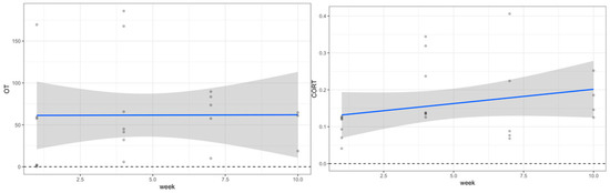 To mirror the analysis of the riders, linear mixed-effects models were performed to examine changes in oxytocin and cortisol in the horses over the four timepoints and over the entire 10-week period from pre- to post-test. There were no changes pre- to post-test during any of the weeks. A Wilcoxon signed-rank test showed no significant changes in oxytocin or cortisol. Over the entire course of the 10-week period, while cortisol increased, there was no statistically significant change (p = 0.203). Similarly, oxytocin was consistent, and there were no statistically significant changes (p = 0.936).