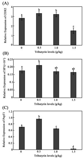 Effect of different levels of tributyrin supplementation in feed on the mRNA expression levels of grass carp intestinal genes. (A–C) The mRNA expression of grass carp intestinal genes CDX2 (A), SP1 (B) and PepT1 (C). The data represent the mean ± SD. Tukey’s multiple range test was performed, and different letters represent significant differences (p < 0.05, n = 4 for each treatment with a total of 12 fish).