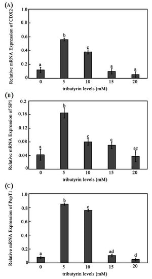 We further examined the regulation of tributyrin on CDX2, SP1, and PepT1 in the grass carp intestinal cells. We found that all of them showed the highest expression level with the treatment of 5 mM tributyrin and then began to fall off. The expression change trends of CDX2, SP1, and PepT1 in grass carp intestine cells were similar with those in vivo. The expression levels of CDX2 and SP1 displayed no significant differences, and PepT1 was inhibited in the group of 20 mM tributyrin compared with those of the control group (Figure 2).