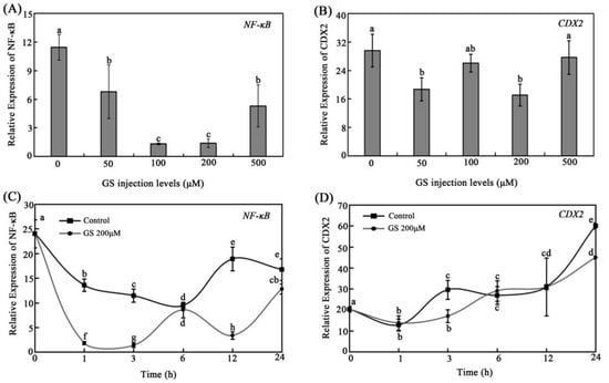 The effect of GS on the expression of NF-κB and CDX2 in intestines of grass carp. (A,B) The relative mRNA expression level of NF-κB (A) and CDX2 (B) of grass carp intestine with injection of different levels of GS. (C,D) The relative mRNA expression of NF-κB (C) and CDX2 (D) with 200 μM GS injection for different times. The data represent the mean ± SD. Tukey’s multiple range test was performed, and different letters represent significant differences (p < 0.05, n = 3 for each treatment with a total of nine fish).