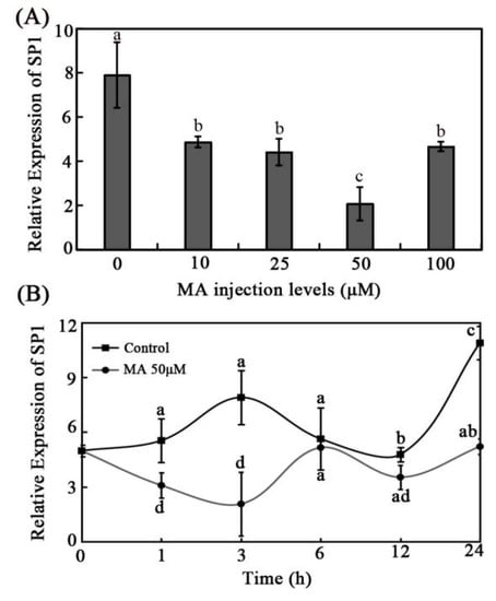 MA could inhibit the expression of SP1 []. To examine whether MA could inhibit the expression of intestinal SP1 of grass carp, the MA injection trial was implemented. The results demonstrated that the SP1 expression level was obviously decreased by different concentrations of MA, especially the 50 μM MA (Figure 4A). The results of different treatment times with 50 μM MA showed that the SP1 expression level was inhibited during the experimental period with a significant difference, except at 6 h post injection compared with the control group. Moreover, SP1 expression level decreased to the lowest level at 3 h post injection (Figure 4B).