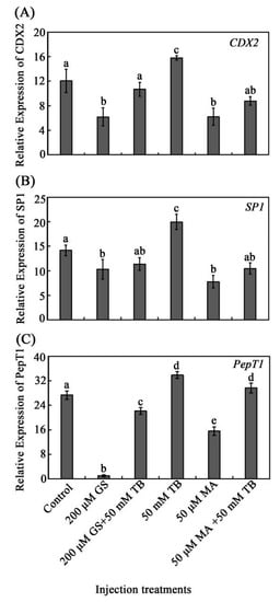 Based on the above injection trial, the optimum concentrations of GS and MA were used in combination with tributyrin, respectively, for another injection trial to analyze whether CDX2 or SP1 mediated the regulation of tributyrin on PepT1. Six groups (control (PBS solution of DMSO), 200 μM GS, 200 μM GS + 50 mM TB, 50 mM TB, 50 μM MA, and 50 mM TB + 50 μM MA) were set. Each group had three replicates with five fish. A total of 90 fish were used and divided into 18 tanks in this injection trial (n = 3 × 5 fish/group). After injection for 3 h, the whole intestines of three grass carp in each tank were collected and frozen in liquid nitrogen. The frozen intestine samples were transferred and stored at −80 °C until further analysis.