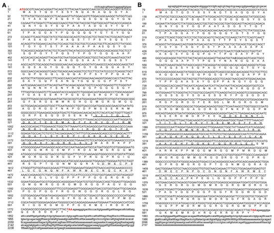 The ORF and predicted amino acid sequences of Cs-ewsr1-w gene (A) and Cs-ewsr1-z gene (B). The UTR region sequence is represented in lowercase letters. The ORF sequence is represented in uppercase letters. The start codon and stop codon are bold in red. An asterisk (*) represents the stop codon at the end of the ORF. The RNA recognition motif is represented by an underscore and the Ran binding protein zinc finger domain is represented by a dot-dash underline.