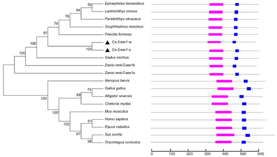 The phylogenetic tree was constructed by using Ewsr1 proteins from 17 different species. The results showed that two Cs-Ewsr1 proteins were clustered together and then embedded with the teleost clade with Paralichthys olivaceus, Scophthalmus maximus and Poecilia formosa. The mammalian and the other species were clustered together (Figure 2). RNA recognition motif and Ran binding protein zinc finger domain were conserved in all the aligned species, including teleost, amphibians, and mammalians.