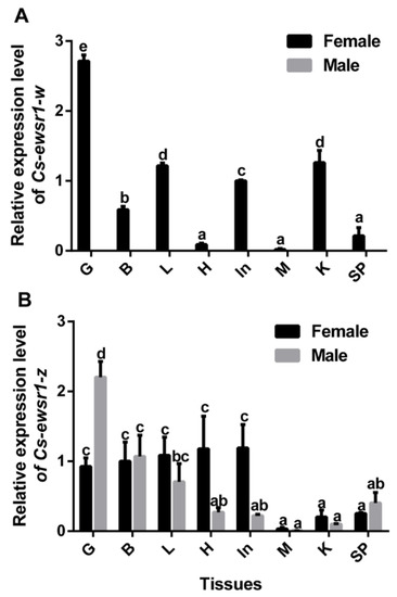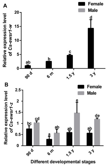 The relative expression patterns of Cs-ewsr1-w (A) and Cs-ewsr1-z (B) genes in female and male gonads from different developmental stages. Different letters represent significant differences among species (p < 0.05).