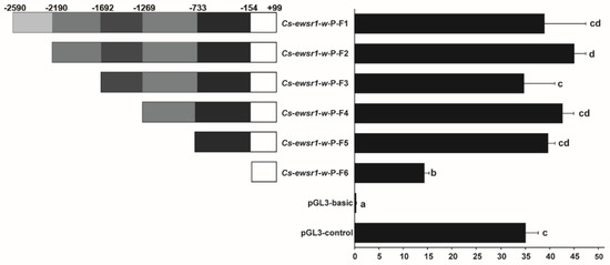 A series of promoter fragments with different length deletion were generated to explore the promoter activity of Cs-ewsr1-w gene. The promoter activities of all Cs-ewsr1-w fragments were significantly higher than that of pGL3-basic (p < 0.05, Figure 5), among which the activity of Cs-ewsr1-w-P-F2/R fragment was the highest. The relative activity significantly decreased by 2.7-fold from Cs-ewsr1-w-P-F5/R fragment to Cs-ewsr1-w-P-F6/R fragment (p < 0.05, Figure 5), indicated region −733 to −154 positively affected the promoter activity of Cs-ewsr1-w gene. Similarly, the positive effect was detected from other two region as well, which were −2190 to −1692 bp and −154 to +99 bp (Figure 5).
