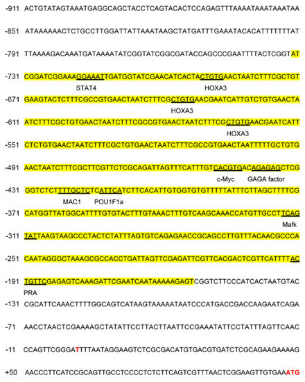 Nucleotide sequence of Cs-ewsr1-w promoter region (−911/+50) and the predicted transcription factor binding sites. The highly active region (-733/-154) was highlighted in yellow. Star codon “ATG” was labelled in red. Underlined boldface letters indicated the predicted transcription factors.