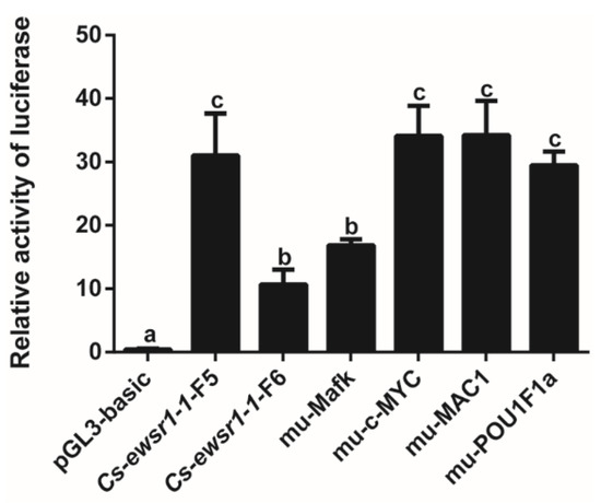 Prediction of TF binding sites in the -733/-154 bp interval of Cs-ewsr1-w promoter revealed numerous TFs binding sites, including STAT4, HOXA3, c-Myc, GAGA factor, MAC1, POU1F1a, Mafk, and PRA (Figure 6). The interval containing TF Mafk, c-MYC, MAC1 and POU1F1a were mutated and transfected into 293T cells for detection after 48 h. The results indicated mutation of Mafk binding site led to the significant decrease by 46% in the activity of Cs-ewsr1-w-P-F5/R fragment (p < 0.05, Figure 7), which showed no significant difference compared with the activity of Cs-ewsr1-w-P-F6/R fragment. Mutations on other TF binding sites showed no significant effect (Figure 7).