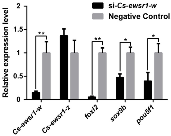 Cs-ewsr1-w expression was significantly reduced by 80% (p < 0.05) after in vitro Cs-ewsr1-w siRNA interference (RNAi), while no significant variation of Cs-ewsr1-z gene was detected. The down-regulation of sex-related genes was detected after Cs-ewsr1-w RNAi (p < 0.05), including foxl2, sox9b and pou5f1. Among that, foxl2 expression significantly dropped by18.8-fold compared with the control group. The expression levels of sox9b and pou5f1 were significantly reduced by half (p < 0.05, Figure 8).