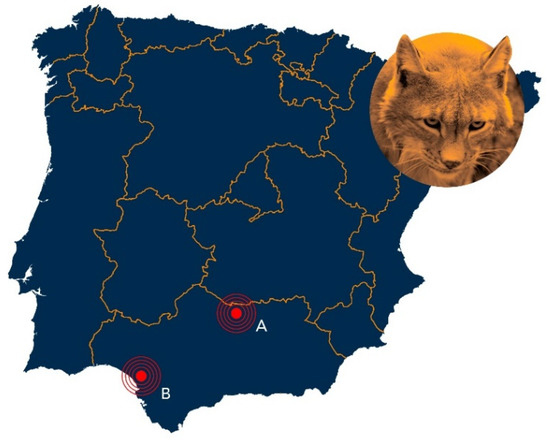 The Iberian lynx (Lynx pardinus) is an endemic feline of the Iberian Peninsula and has been listed in Spain as an endangered species since 30 March 1990 [1]. Wild populations of Iberian lynx have suffered a constant regression for the past century, with a vertiginous decline of 90% in the last 20 years [2]. At the beginning of the Conservation Program, it was estimated that less than 200 Iberian lynxes were left on the planet, distributed between two isolated populations, Doñana National Park and Sierra Morena (Spain) [3,4]. There are three significant plans for the conservation of the Iberian lynx, the “Wild cats: Status Survey and Conservation Action Plan” [5], “Estrategia para la Conservación del Lince Ibérico (Lynx pardinus) en España” [6], and “Action Plan for the Iberian Lynx in Europe (Lynx pardinus)” [7]. These three plans for conserving the Iberian lynx include five autonomous communities in Spain (Andalucia, Castilla-La Mancha, Castilla y León, Extremadura, and Madrid) and Portugal [2].