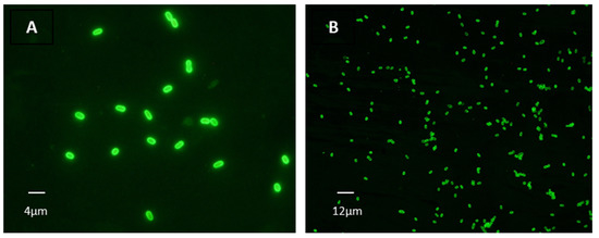 Positive reactivity of lynx sera against E. cuniculi spores by IFAT. (A): 1:100 titer (magnification 1000×). (B): 1:800 (magnification 400×).