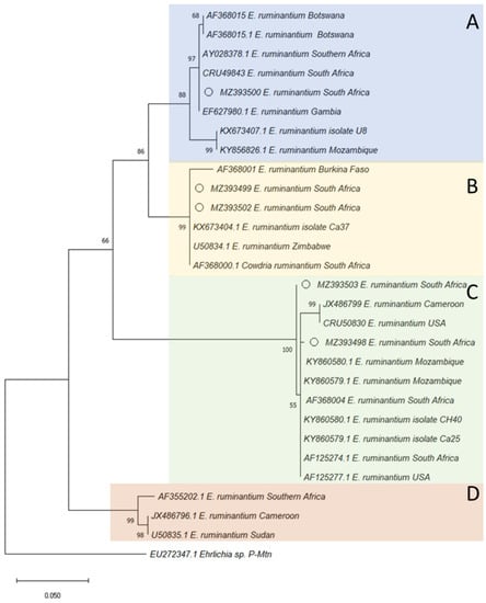 - Steyn, H.C.; Pretorius, A. Genetic diversity of Ehrlichia ruminantium field strains from selected farms in South Africa. Onderstepoort J. Vet. Res. 2020, 87, 1–12. [Google Scholar] [CrossRef] [PubMed]
