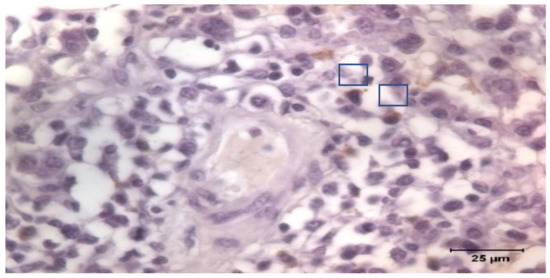 The tissue samples were fixed in Bouin’s solution. The samples were processed routinely for paraffin-embedded tissue production into the first week after sampling. A series of 4 μm slides were stained and immunohistochemistry was applied following the Avidin Biotin Complex (ABC) technique. Goat anti-Pig IgA Antibody Affinity Purified (Bethyl Laboratories Inc., Montgomery, TX, USA) was used as primary antibody incubated overnight, and a Polyclonal Goat Anti-Rabbit Immunoglobulins/Biotinylated (Dako, Glostrup, Denmark) as secondary. The Vectastain Elite ABC kit (Vector Laboratories Inc., Newark, CA, USA) was applied for 1 h at 20 °C, and positive labeling was detected using 3,3′-diaminobenzidine tetrahydrochloride (Dako, Glostrup, Denmark). The tissue sections were counterstained with Mayer’s hematoxylin, dehydrated, and mounted. Once identified, IgA producing cells were counted by images software analysis under a Zeiss Axioskop 40 light microscope (Carl Zeiss AG, Oberkochen, Germany; Figure 1). The count was the average of the cells counted in 10 non-overlapped fields of 10.000 μm2.