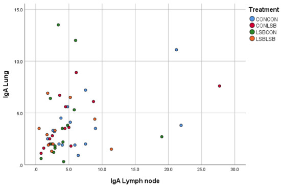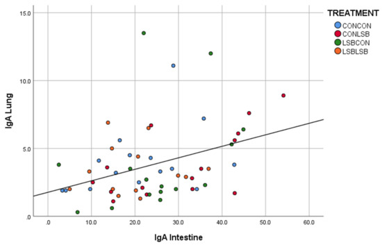 In most animals, the mucosal immune system is responsible for the active immune responses control [23]. The mucosal immunity is mainly based on IgA response [24,25]. Therefore, any vaccine or action focused on mucosal defense should be able to produce a remarkable IgA concentration, as is the case of the APP vaccine in our study. We found fewer IgA producing cells in the lymph node of both LSB-fed piglets and piglets from LSB-fed sows. One may think that the mucosal immunity of those piglets was lower; however, mucosal immunity develops in response to a challenge after the antigen presentation by the dendritic cells or the reaction to the release of several cytokines [24]. Therefore, we could hypothesize that the lower IgA producing cells found in those animals indicates that they were less challenged in terms of contact with an immune stimulating organism/agent, suggesting higher mucosal protection explained by the LSB supplementation to the sows and the own piglet’s intake. Furthermore, there was a positive correlation in the number of IgA producing cells between jejunum and lung, which could suggest that the lower contact with the immune stimulating organism started in the gut. The reduction in IgA in piglets supplemented with a probiotic was already reported [26].