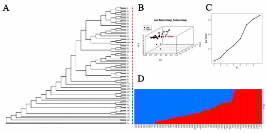 (A): Phylogenetic tree: red circles represent Cele Black sheep, black circles represent Hetian sheep. (B): Principal component analysis. (C): Cross validation errors of ancestral clusters K. (D): Population structures with number of ancestral clusters K equaling two. Each color represents one ancestral cluster. The length of colored segments represents corresponding ancestry attributions.