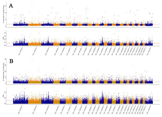 (A): The area above the dotted line includes Hetian sheep/Cele Black sheep are subject to selection. (B): The area above the dotted line includes Cele Black sheep/Hetian sheep subject to selection.