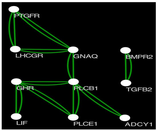 Based on selective signatures analysis (Figure 3), we identified 376 genes under selection (Supplementary Materials Additional File 1). Based on GO annotation, KEGG enrichment analysis and related references of the 376 genes, 12 genes (PLCE1, SPIRE1, DIAPH2, GABRA3, GNAQ, GHR, DNMT3B, PLCB1, ABCC8, PTGFR, PAK1, ADCY1) were associated with pubertal initiation and 11 genes (ADCY1, POU1F1, BMPR2, HS6ST1, LHCGR, DNMT3B, GHR, LIF, PAK1, TGFB2, GNAQ) were associated with litter size. From these genes, we selected 25 SNP loci with high Fst values for further validation. Protein interaction analysis revealed interactions between PTGFR, LHCGR, GNAQ, GHR, PLCE1, LIF, PLCB1, ADCY1, BMPR2, and TGFB2 (Figure 4). The selected genes included several SNPs potentially linked with pubertal initiation: six SNP loci in GNAQ, three in GHR, one in DNMT3B, two in PAK1, and six in ADCY1. Furthermore, several SNPs linked with litter size were found: six SNP sites were located in ADCY1, one in POU1F1, four in BMPR2, one in LHCGR, one in DNMT3B, three in GHR, one in LIF, two in PAK1, and six in GNAQ.