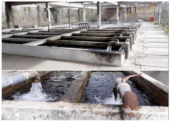 Rainbow trout cultivation comprises mainly grow-out techniques of farming that depend on physical water supplies. For instance, cage farming in water reservoirs (lakes, seawater, and ponds) has gained popularity over the last decade [16]. Although this technique can demonstrate advantages, such as larger cultivating space and bigger production, climate change limits this advantage through acute changes in abiotic factors. Additionally, there are farming units in which water supply is available through springs or rivers, such as flow-through systems in concrete raceways (Figure 1), which are considered to be ideal, exploiting the clarity of the optimal conditions of incoming water and exporting the final wastes back to the riverbanks. Although this technique is common in many countries, many others have established legislation in order to minimize waste exportation to water reservoirs [17]. Additionally, flow-through systems, especially from rivers, have been proven to be dangerous for each other when they co-exist on the same riverbank and the transfer of waste occurs from one to another through the water supply.