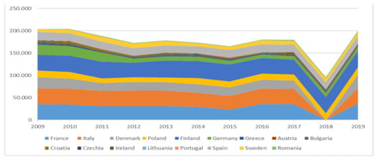 Figure 2. Popular countries with significant production of rainbow trout (tons) in the years 2009–2019 (EUMOFA 2020–2021; EUROSTAT; FEAP 2014–2019).
