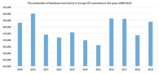 Figure 3. The production of rainbow trout (tons) in Europe (27 countries) in the years 2009–2019.