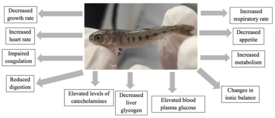 When fish are exposed to several stress factors, such as climate change effects, levels of catecholamines, corticosteroids, cortisol, glycogen, and lactic acid increase [41]. Thermal stress responses lead to the release of hormones into the blood and tissues, thus, resulting in changes in energy mobilization, ionic balance, immunological responses, cardiac activity, physical performance, growth, and reproduction [96,97,98,99]. Reproductive performance of fish, and in particular, sexual maturity and sex differentiation are affected [100,101,102,103]. Specifically, temperature changes either promote or delay gametogenesis [100,101,102,103]. Extreme high temperatures reduce gene steroidogenesis [101,104,105,106,107], inhibit sperm production, and affect sperm motility in rainbow trout [108]. Moreover, global warming causes changes in the nerve tissues (neuroendocrine function) of the rainbow trout and affects the normal functioning of the central nervous system, which is a major threat to aquaculture production [109,110,111]. Temperature affects gills plasticity through impairments of Na, K, and ATPase activities at 24 °C, therefore, resulting in changes in ionic balance [112,113,114].