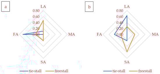 When analyzing the data on the number of design errors (Figure 1b), it is worth paying attention to the differences in the distribution of results in the analyzed areas (LA, MA, SA and FA) between barns with tie-stall and freestall housing systems. In two areas (LA and FA) in tie-stall barns, we found a higher number of construction errors compared to barns with alternative housing systems; in the other two areas (MA and SA), the greater number of errors per barn occurred in buildings with the freestall system. The highest number of construction errors (0.63 per barn) was found in the lying area (LA) of buildings with the tie-stall housing system and in the social area (SA) of buildings with the freestall housing system, where the number of construction errors was 0.58 per barn.