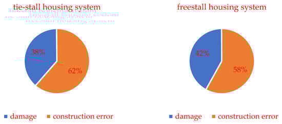 Both in the barn with tie-stall and freestall housing systems, a higher percentage of design errors than damage was found, with the difference being that in barns with a tie-stall housing system, the share of construction errors was higher (62%) compared to barns with a freestall housing system (58%). Accordingly, a higher percentage of damage was found in barns with a freestall housing system compared to barns with a tie-stall housing system.