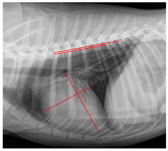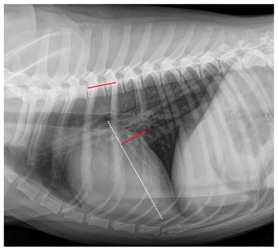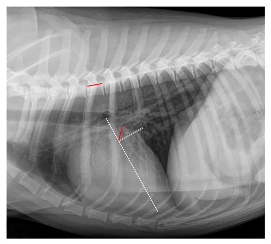 The VLAS was obtained as defined by Malcolm et al. (2018) [], drawing a line from the ventral margin of the carina tracheae to the dorsal intersection between the cardiac silhouette and the caudal vena cava. Afterward, this line was transposed to the vertebral column and in vertebral units as described previously. A measurement example is displayed in Figure 4.
