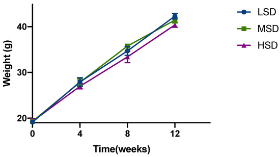As shown in Figure 1, after 12 weeks of feeding, different stocking densities had an effect on the body weight of Kunming mice. The initial body weight of the mice in each group is basically the same; after 12 weeks, it can be observed that the weight of the mice in the LSD group is the highest, and the weight of the mice in the HSD group is the lowest, which demonstrated a negative correlation between feeding density and weight. In addition, the mice in the HSD group demonstrated a decreased amount of drinking. The above results suggested that different densities of feeding had certain effects on the quality of Kunming mice.