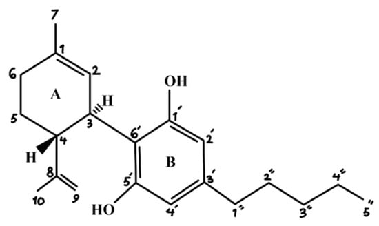 CBD is a phytocannabinoid with the formula C21H30O2 and a relative molecular mass of 314.464 g. mol−1 [35]. The structure of CBD is shown in Figure 1. This molecule consists of a cyclohexene ring (A), a phenolic ring (B), and a pentyl chain. The activity of CBD is attributed to the location of three carbon positions [35]: