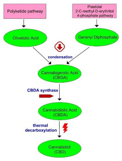 Cannabidiol is produced in the glandular trichomes of the female hemp flowers [10]. Figure 2 depicts the stages of CBD biosynthesis. Two main precursors (olivetolic acid and geranyl diphosphate) are synthesized in separate pathways [3]. Approximately 95% of the CBD is found in an acidic form such as cannabidiolic acid (CBDA) in fresh biomass [36]. Decarboxylation can be spontaneous, thermal, or alkaline [10]. Terpenes and terpenoids responsible for flavor and aroma can be lost during the decarboxylation process, a disadvantage of decarboxylation [37].