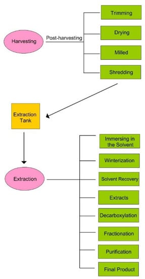 There are different stages in Cannabis processing: selection of variety, cultivation, harvesting, and extraction [10]. In the hemp industry, extraction can be performed from trichomes (chemical extraction) or hempseeds (mechanical extraction) [10]. In the trichome category, cannabinoids and terpenes are extracted. Figure 3 shows the general procedure for cannabidiol extraction. After harvesting, flowers are trimmed (manually or using machines) and should be dried at a low temperature without exposure to the sunlight to inhibit photochemical transformation.