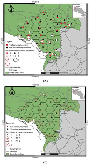 Camera trap deployment array at trail (n = 29) and off-trail (n = 29) locations in Sector Santa Rosa, Guanacaste Conservation Area, Northwestern Costa Rica; (A) Spatial detections of different female (♀) jaguars at camera locations; (B) Spatial detections of different male (♂) jaguars at camera locations.
