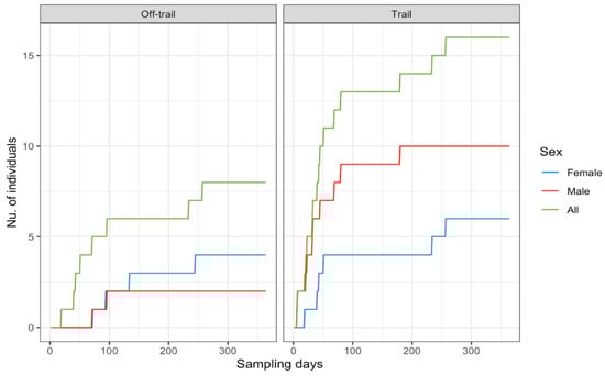 Accumulated number of jaguar individuals by sex at trail/off trail camera placement locations across sampling days for a jaguar camera trap density study in Sector Santa Rosa, Guanacaste Conservation Area, Northwestern Costa Rica.