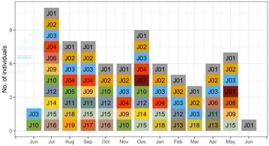 Monthly number of jaguar individuals (number- and color-coded) registered (June 2016–June 2017) in a camera trap density study in Sector Santa Rosa, Guanacaste Conservation Area, Northwestern Costa Rica.