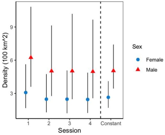 Sex/session specific jaguar density, from top model structure in Sector Santa Rosa, Guanacaste Conservation Area, Northwestern Costa Rica. The black line represents 95% confidence intervals.