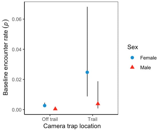 Sex-/camera trap location-specific effect on jaguar baseline encounter rates, from top model structure in Sector Santa Rosa, Guanacaste Conservation Area, Northwestern Costa Rica. The black line represents 95% confidence intervals.