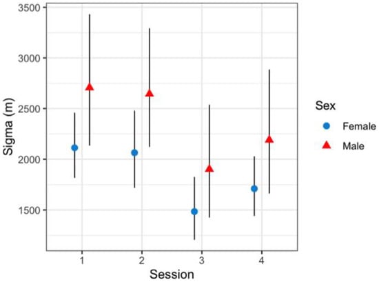 Sex-/season-specific effect on jaguar sigma (m) from top model structure in Sector Santa Rosa, Guanacaste Conservation Area, Northwestern Costa Rica. The black line represents 95% confidence intervals.