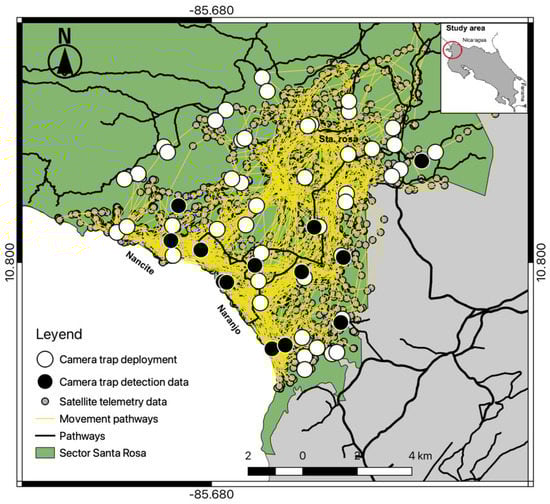 Spatial detections by camera trap of the radio-collared female jaguar within the study area, overlaid on the satellite telemetry data for the same individual in Sector Santa Rosa, Guanacaste Conservation Area, Northwestern Costa Rica.