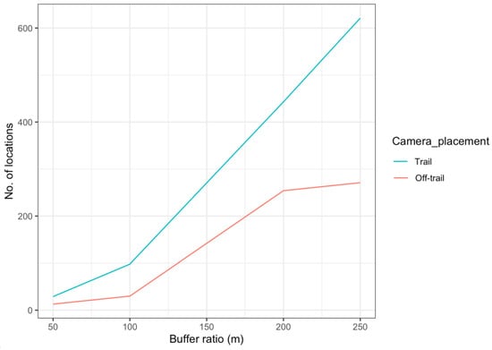 Number of satellite telemetry locations of a collared female jaguar, located within multiple buffer ratio distances around camera location placements (trail/off-trail) in Sector Santa Rosa, Guanacaste Conservation Area, Northwestern Costa Rica.