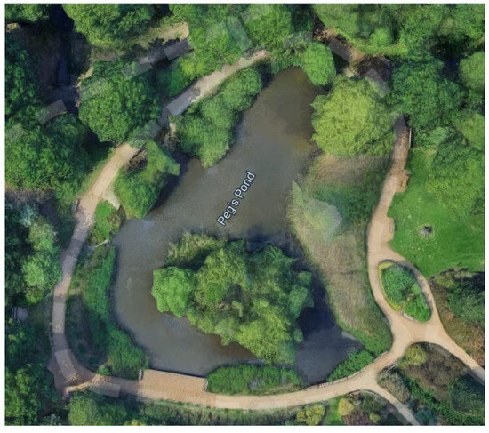 Google Maps view of Peg’s Pond with an area of open water of approximately 936 m2. Google (2022) Isabella Plantation, Richmond Park. Available online: http://maps.google.co.uk (accessed on 26 July 2022).