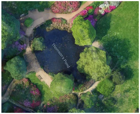 Google Maps view of Thomson’s Pond with an area of open water of approximately 439 m2. Google (2022) Isabella Plantation, Richmond Park. Available online: http://maps.google.co.uk (accessed on 26 July 2022).
