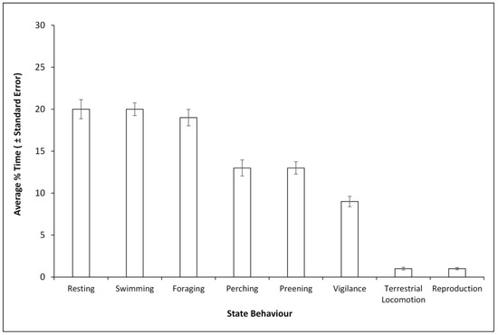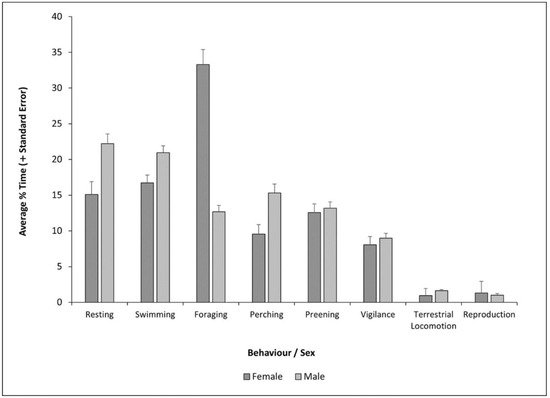 As described above, females and males shared predominant state behaviours of resting, swimming, foraging, perching, preening and vigilance (Figure 4). In females, these behaviours accounted for 96% ± 141% of their total behaviours, and in males, 94% ± 136%. Females had a higher rate of natural foraging than males, and a lower rate of vigilance than males (Table 2). Lastly, vocalisation occurred less frequently in females than males (Table 2).