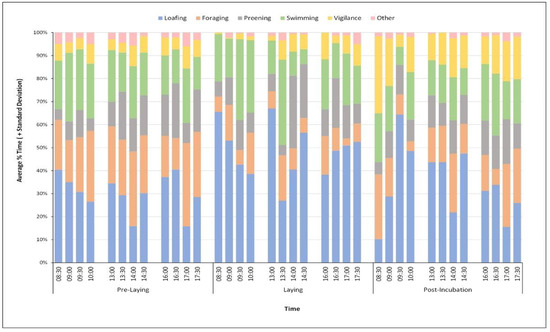 However, all analyses showed that ducks had a significantly higher rate of natural foraging during the Pre-Laying period than the Laying period (Table 2). Analyses also showed that ducks spent the most time being active during the Pre-Laying period than both the Laying and Post-Incubation period and the most time being inactive during the Laying period than both the Pre-Laying and Post-Incubation period (Table 2)